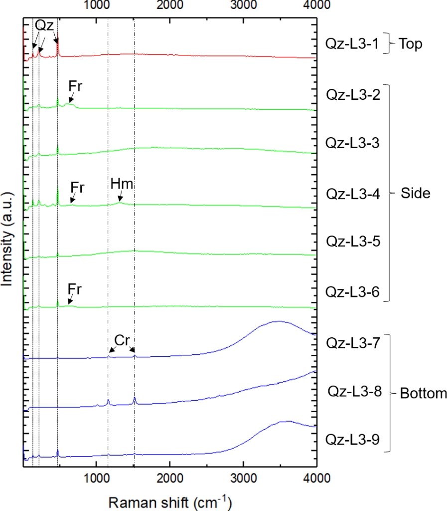 2 柴达木盆地西北干旱区类火星环境石英岩碎屑样品部分测量位点的拉曼光谱图。Qz:石英;Fr:锌铁矿;Hm:赤铁矿;Crβ-胡萝卜素