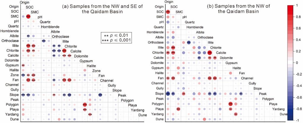 图2 柴达木盆地样品理化性质的相关系数矩阵。(a)柴达木盆地西北部和东南部样品理化性质的相关系数矩阵,(b)柴达木盆地西北部样品理化性质的相关系数矩阵。颜色条表示两个参数之间相关系数的范围;符号**表示显著性水平≤0.01,***表示显著性水平≤0.001;Origin:沉积物来源,SMC:含水量,SOC:有机碳含量