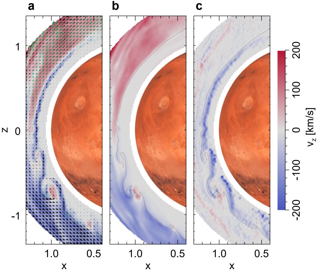 基于三维太阳风-火星相互作用的混合模拟程序,研究人员发现,KH波动起初在日下点附近被激发并呈准正弦位形。随着时间的推移,波动沿着-E方向发展,波长断增加,同时伴随着涡旋的产生,最后延伸到整个-E半球(图2)。这种半球不对称的波动周而复始地产生、演化。为了探究其物理机制,他们还研究了磁堆积边界附近的氢离子流场(如图3)。研究表明,在磁堆积边界附近,质子流速增强,方向主要沿着-E方向并几乎垂直于磁场。这个质子流剪切电离层,导致了KH不稳定性的产生。进一步研究表明,这个剪切流是由质子抗磁漂移运动造成的。磁层外的氧离子受太阳风电场的加速,沿着+E方向运动,同时拖曳磁场在+E半球堆积,从而导致该区域的磁场比-E半球更强(图2a)。由于热压梯度引起的漂移速度与磁场强度的倒数成正比,因此-E半球中的漂移速度更快。换句话说,两半球的磁场强度差异产生了指向-E半球的磁压力,在边界层中引起沿-E方向的质子流,并且其速度不断增加。上述解释也符合前人基于动量守恒所得到的基本认知:氧离子直接由电场加速朝+E方向运动,而质子则被推向相反的方向。