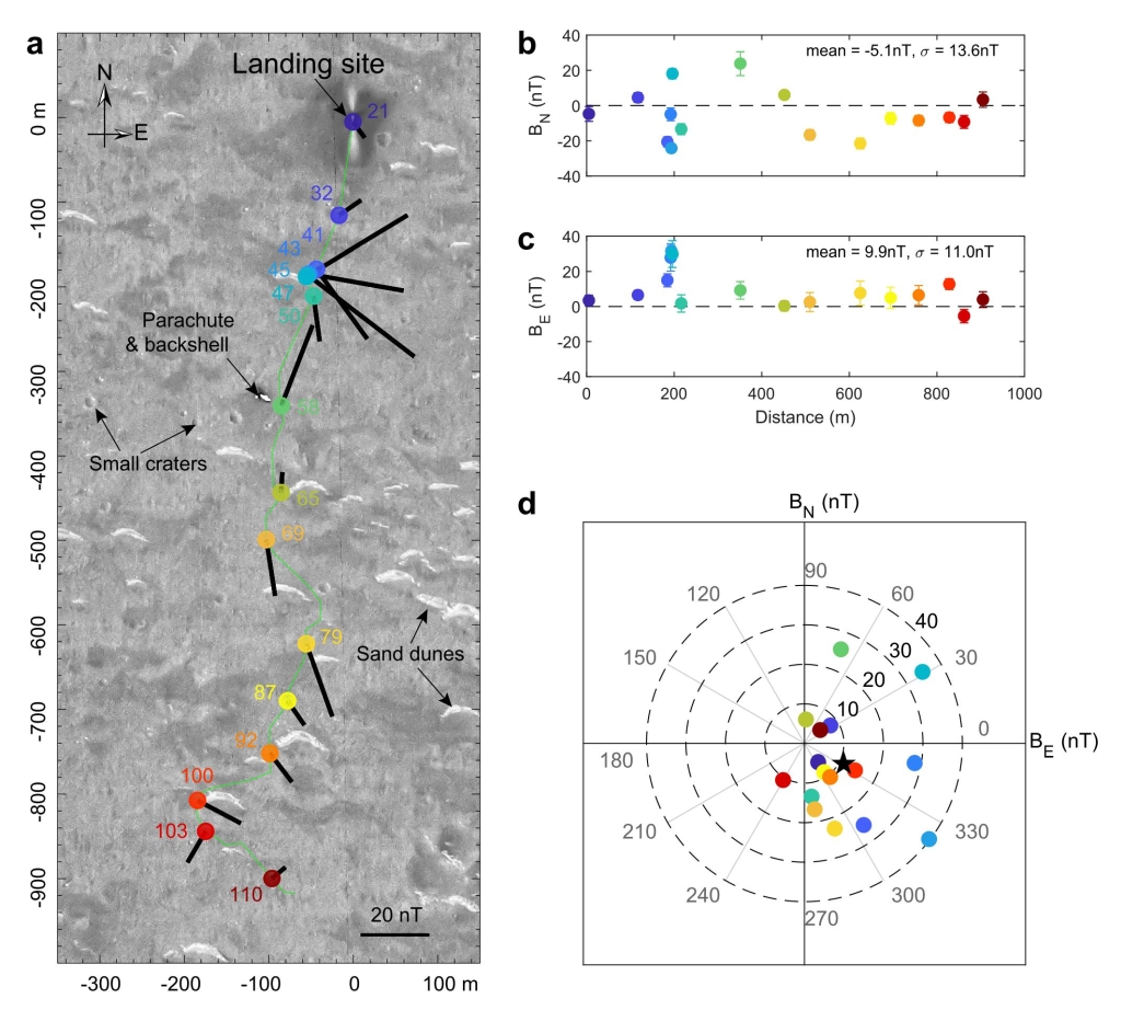 我国天问一号火星任务的“祝融号”火星车于2021年5月15日成功着陆于乌托邦盆地南部边缘,火星车携带了磁通门磁强计,开启了人类在火星表面的首次磁场巡视探测。800彩票杜爱民团队提出了利用火星车及桅杆共同旋转的方法,在“天问一号”工程大总体的组织实施下,对磁强计进行了在轨标定,实现了火星磁场和火星车干扰场的分离,使得火星表面多点原位测量的精度达到了~1 nT。