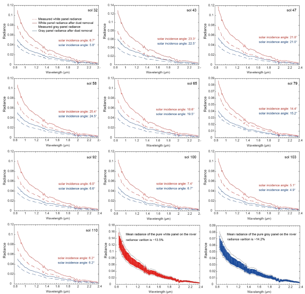 然而,火星经常出现沙尘暴,这不仅覆盖了地表,还覆盖了探测设备,进而影响载荷的探测性能。光谱观测中,精确的定标至关重要,但不幸的是,火星车上的两块定标板(白板和灰板)很快被沙尘覆盖。虽然没有专门的相机记录定标板的状态,但根据太阳能板上的沙尘积累情况(图2),沙尘覆盖问题显而易见。沙尘覆盖了定标板,导致使用这两块板定标的同一目标光谱数据不一致,而且得到的火星表面反射率显著大于所有其他火星探测任务观测的结果,这给数据解释带来了极大的挑战。