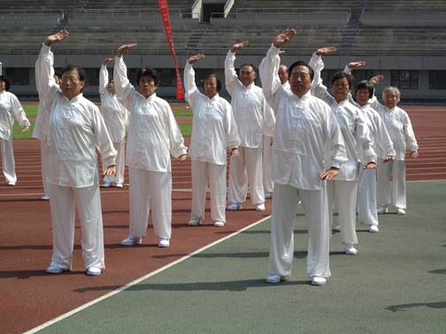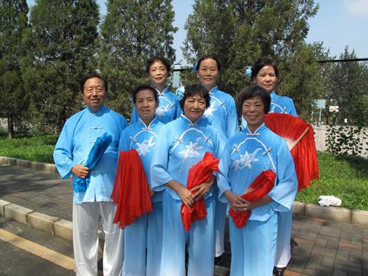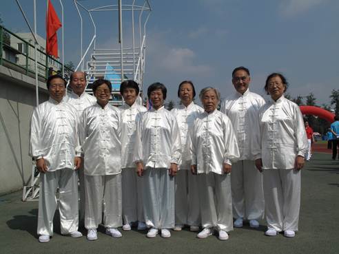 参加八段锦比赛的老同志正在比赛,他们获得了第三名的好成绩