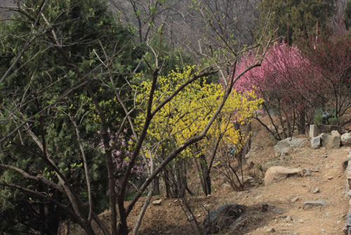 参观完地震台后,大家一起兴致勃勃地登起了鹫峰。山间小路弯弯绕绕,旁侧是烂漫的山花,白的李花,黄的连翘,还有粉红的桃花。一群中学生拿着铁锹穿插而过,想在山上留下希望的树苗。看到两位老大妈迈着轻巧的步伐赶上了我们,不禁唏嘘感慨:健康在繁忙的工作中已经不知不觉地透支了许多,今后加强身体锻炼极为必要。登上峰顶,在春风拂面中向东瞭望,片片新区、条条新路勾勒出一个快速发展的北京城。