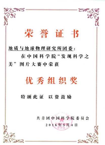 大会还对中科院团委、中科院青联、中科院科学传播局联合组织开展的“发现科学之美”图片大赛获奖个人和单位进行了表彰。此次活动为期两个月,共评选出特别奖5幅(我所刘嘉麒院士的作品获奖),一等奖6幅(我所职工任晖的作品获奖),二等奖16幅,三等奖33幅(我所职工任晖、柴立晖的作品分别获奖),优秀奖103幅,评选出优秀组织奖获得单位23个(我所团委获此奖励)。