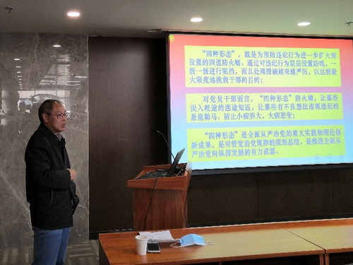 2020年11月9日,机关党支部开展“追寻先辈足迹,牢记使命担当”主题党日学习活动。活动邀请所党委副书记钟华为机关党支部讲党课。钟华以“监督执纪‘四种形态’”为题,讲解了“四种形态”的含义,如何精准把握“四种形态”指标体系,正确理解和面对“四种形态”的要求。钟华强调,“四种形态”是对党员干部的严格要求,也是对党员干部的关心和爱护,在监督执纪的过程中,关键要运用好第一种形态,避免小问题演变为大问题。