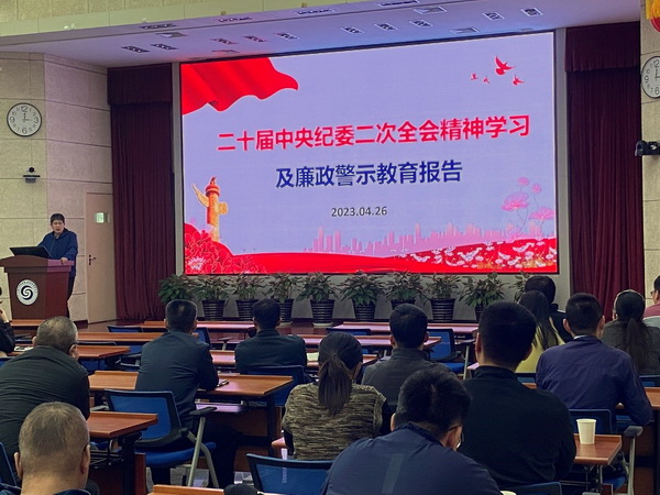 4月26日,机关党支部在地3楼二层报告厅组织召开二十届中央纪委二次全会精神学习及廉政警示教育大会。会议邀请所党委副书记、纪委书记杨俊成作报告,管理服务部门40余人参会。