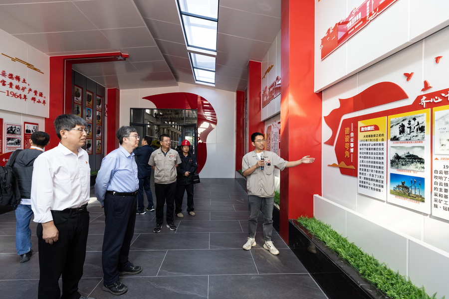 杨俊成一行先后参观了包钢(集团)公司矿史馆、铁矿历史馆。史馆丰富的图片资料、实物及模型展示出白云鄂博铁矿的发展历程,其中不乏以何作霖、涂光炽、张培善为代表的我所老一辈科学家的身影。老一辈科学家艰苦奋斗、协力攻关,为白云鄂博矿床的发现与形成机理研究作出了不可磨灭的贡献。新时代、新征程、新使命,年轻后辈勇毅接棒、接续努力,为矿床地质研究与资源综合利用再建新功。