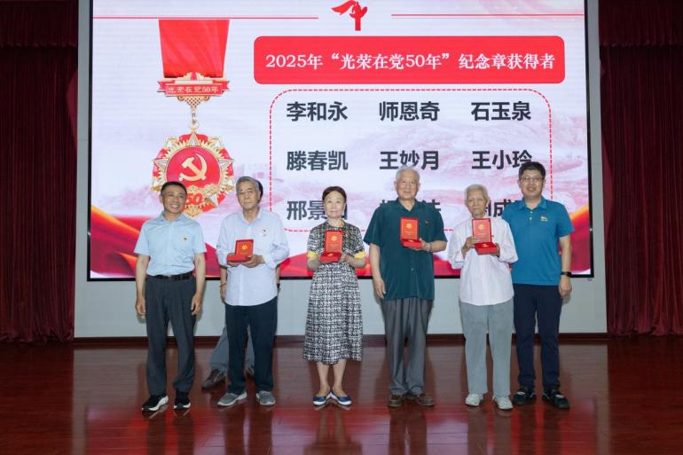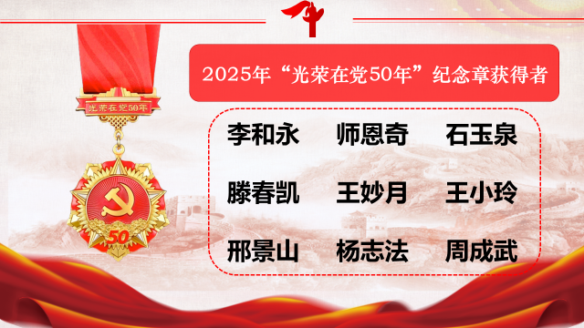 为“光荣在党50年”党员代表(杨志法、王小玲、石玉泉、王妙月)颁发纪念章