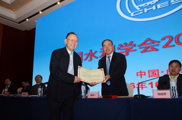 图1 中国水利学会理事长胡四一为汪集旸院士颁发获奖证书