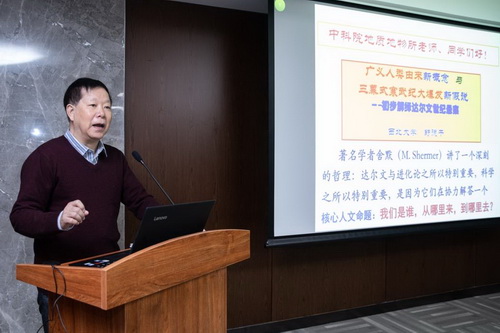 12月20日,西北大学舒德干院士应邀来我所进行学术交流,并作题为“三幕式寒武纪大爆发与广义人类由来——破解达尔文世纪难题”的地球科学前沿论坛报告。报告由潘永信院士主持。 达尔文1859年正式出版《物种起源》,创建了生物进化论。但进化论一直受到三个问题的困扰:(1)遗传学的真谛是什么?(2)过渡类群的缺乏,特别是以寒武纪大爆发为典型;(3)人类源自低等动物真实的直接证据。孟德尔的颗粒遗传、摩尔根的基因学说、以及沃森和克里克的DNA双螺旋结构等遗传学理论,解决了第一个难题;剩余的两大难题一直缺少实证。 舒德干院士领军的西北大学早期生命研究团队经过几十年来对云南澄江动物群的研究,提出了“三幕式寒武纪大爆发”假说:第一幕是埃迪卡拉群期,构建基础动物亚界;第二幕是小壳动物群期,构建原口动物亚界;第三幕是澄江动物群期,构建后口动物亚界。 该假说认为:约5.6亿—5.2亿年前,动物经历了从双胚层到三胚层,再到口肛倒转、新陈代谢系统不断升级的演化过程,基础动物、原口动物、后口动物三大亚界先后由量变到质变,依次发生门类爆发,揭示了寒武纪生命大爆发的本质内涵,首次勾勒出基础动物、原口动物、后口动物三大枝系演化“大树”的基本轮廓。2017年1月31日,Nature杂志以封面亮点论文的形式在线提前发表了舒院士团队的重大研究发现——最古老的人类远祖:冠状皱囊动物。这种成体仅1 mm的动物,被认为是迄今为止发现最古老的原始后口动物, 其“为人类远古起源研究的‘重大悬案’找到了实证”。此外,他们的团队发现了昆明鱼目、古虫动物门等关键化石,都为解决动物演化及人类由来提供了实证。 百余名科研人员和学生参加了本次会议并进行了积极热烈的讨论。潘院士与舒院士希望未来加强在地球生物学领域的深入合作与优势互补,并寄语年轻人永攀登科学高峰。