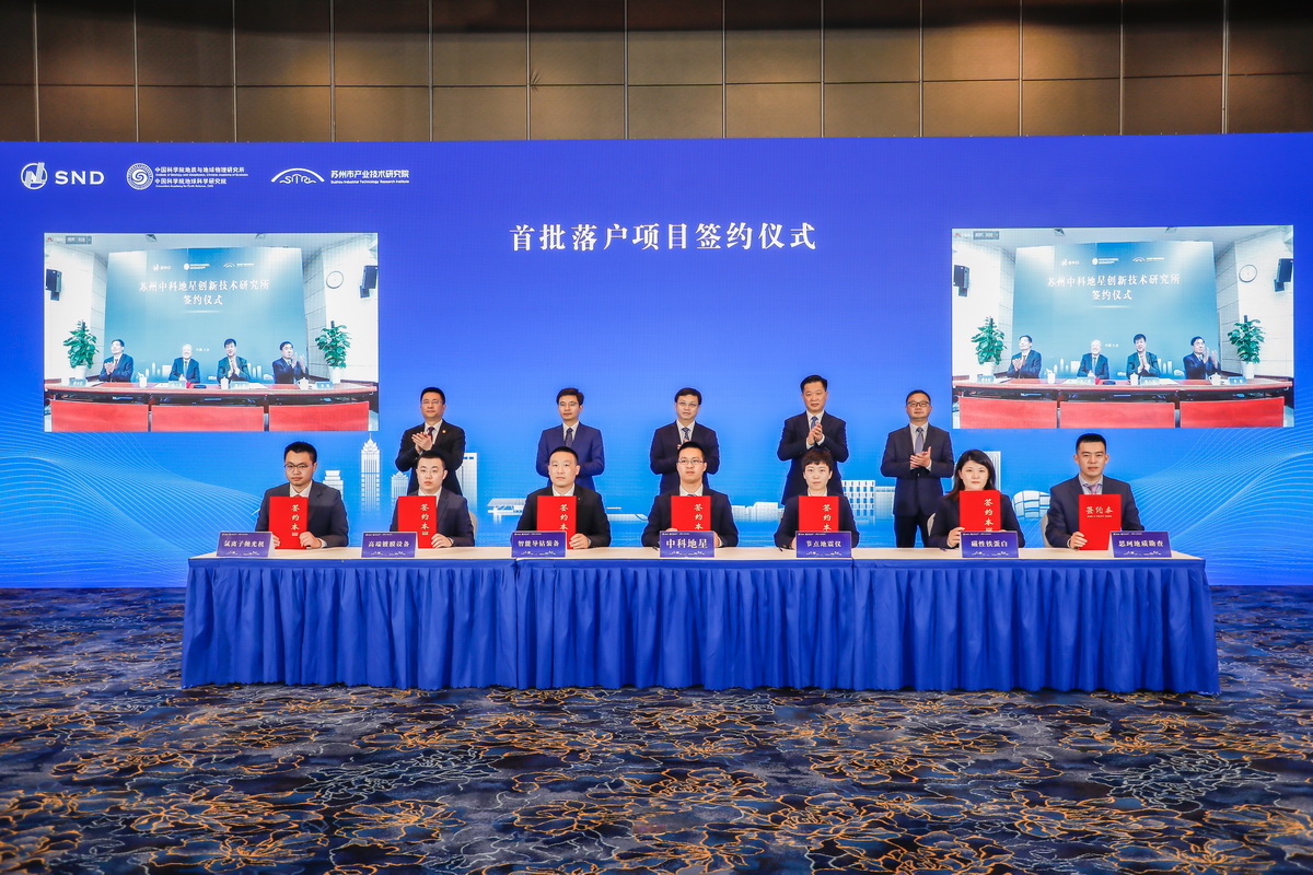 签约仪式上,曹路宝代表苏州市委、市政府讲话,他对支持苏州科技创新产业发展的院士专家团队表示感谢,重点介绍了苏州市科技产业的总体情况、发展规划及相关政策、资金与产业资源配套条件等,他强调要充分发挥有效市场和有为政府作用,全力打造一批高水平创新集群,推动苏州产业经济向创新经济跃升、产业大市向创新强市迈进;张小雷代表我所致辞,强调研究所始终牢记身为国家战略科技力量的历史使命,聚焦前沿科学研究与关键核心技术攻坚,研究所一直在积极探索科技成果转化的有效途径;朱日祥代表团队表达了对苏州市政府的感谢,他表示当今世界资源能源的发展正经历由“资源为王”向“技术为王”的转变,要保障国家资源能源安全,出路就是技术革命。他强调团队已在节点式地震仪、近钻头地质导向仪等装备上取得了重大突破,亟待通过“政产学研用”全链条的科技创新实践,破解科技成果产业化“最后一公里”路不通的难题。