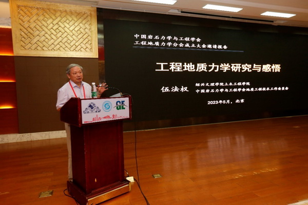 当日,分会组织召开了工程地质力学创新论坛。何满潮以“工程地质力学的使命”为题,介绍了隧道开挖补偿法的原理、规律、材料、技术,并从深部分区及破坏特点,开挖补偿力学机理及其工程应用实践等方面,阐述了工程地质力学的使命。底青云作题为“深地电磁探测装备技术及工程应用”的报告,指出电磁探测技术的研究意义与现状,并分别介绍了电磁探测装备技术在航空、地面和海底领域的应用,在此基础上提出电磁探测装备技术的发展前景与思考。伍法权以“工程地质力学研究与感悟”为题,从工程地质学的形成、工程地质力学的历史贡献、发展状态、工程地质力学探索的可能途径等方面分享了工程地质力学的研究成果与切身感悟。