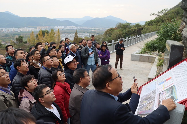 会议报告结束后,参会人员于24日下午在前往煤山“金钉子”剖面进行实地考察。该剖面同时拥有2颗“金钉子”的地质剖面,其中的二叠系—三叠系界线“金钉子”既是两系之间的界限,又是古生界与中生界的分界,其完整记录了2.5亿年前的生物大灭绝事件,具有极其重要的科研价值。沈树忠院士带领大家参观了该剖面的重要区段,并详细介绍了该剖面各单位的研究历史、研究发现并指出未来还需要继续研究的方向,邀请大家共同为特提斯重大地质事件深入研究贡献智慧。
