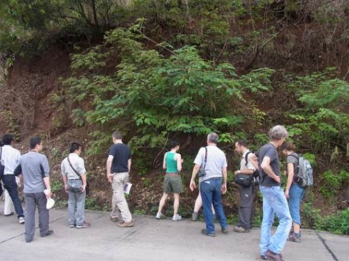 会后考察人员参观峨眉山二叠纪玄武岩二滩露头