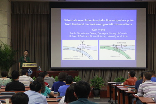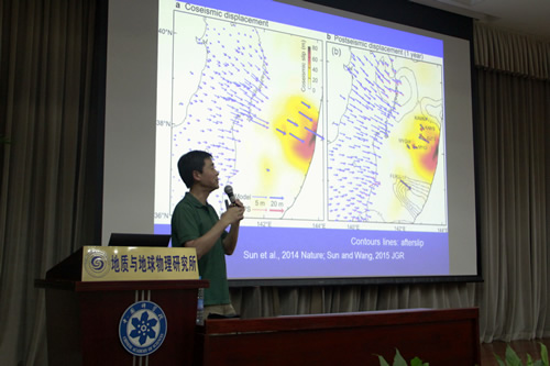 王克林做了题为“Deformation evolution in subduction earthquake cycles from land- and marine-based geodetic observations”的学术报告。美国伊利诺伊大学香槟分校助理教授刘丽军博士和来自中国地震局地质研究所、中国地震局地震预测研究所、中国科学院青藏高原研究所、中国科学院大学及本所师生近百人参加了学术报告会。