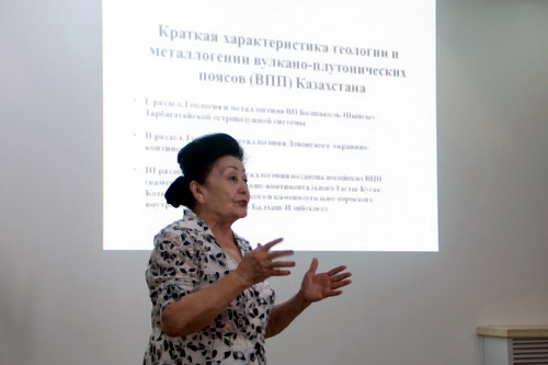 在学术交流会上,Eleonora Seitmuratora教授作了题为 Stratigraphy, granitoids and associated ore deposits of the Balkhash metallogenic belt, Kazakhstan”的学术报告。她首先对东哈萨克斯坦的区域地质概况作了介绍,并着重将波谢库尔-麦卡因地区与成吉思-塔尔巴哈台地区进行了对比。接着她对东哈萨克斯坦地区泥盆纪地层特征进行了详尽的介绍,并对该区岛弧及火山构造进行了着重介绍。最后,Eleonora Seitmuratora教授对东哈萨克斯坦地区石炭系-二叠系地层进行了系统的梳理,并详细介绍了她所做的该区101个剖面并对该区火山岩做了剖析。针对我国新疆地区与哈萨克斯坦地区区域对接问题,Eleonora Seitmuratora教授给出了自己的看法和建议,并对东哈萨克地区斑岩成矿的潜力做出了评价。