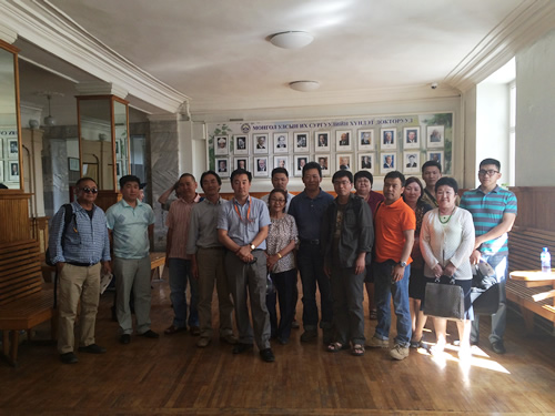 随后,代表团参观了蒙古国立大学(The National University of Mongolia),并与蒙方地质专业人员开展学术交流。代表团成员曾庆栋研究员和赖勇教授分别作了题为“Porphyry metallogenesis in eastern segment of the CAOB.”、“Mo mineralization and evolution of the ore-forming fluid in Northeast China”的学术报告,详细介绍中亚造山带东段斑岩矿床时空分布规律、斑岩成矿作用和流体演化规律等方面最新进展,与参会科研人员进行了热烈的讨论和交流,增进两国地质人员有关斑岩成矿作用研究的了解,奠定了进一步合作的基础。