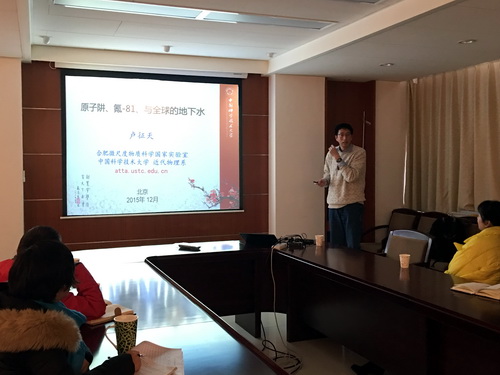 访问期间,卢征天教授作了题为“原子阱、氪-81与全球地下水”的学术报告。他以地下水的14C定年为例,介绍了地下水定年的原理、方法,分析了存在的问题。重点介绍了ATTA技术的由来和发展现状。他对81Kr和85Kr与其它方法在地下水定年中的作用和效果进行了比较,表明开展Kr定年的重要意义及其相对与其它方法的优势。他用实例介绍了ATTA方法在地下水、海水、极地冰川、大气等方面在世界各地已经取得的应用成果,主要包括以色列、澳大利亚,南美等地区。