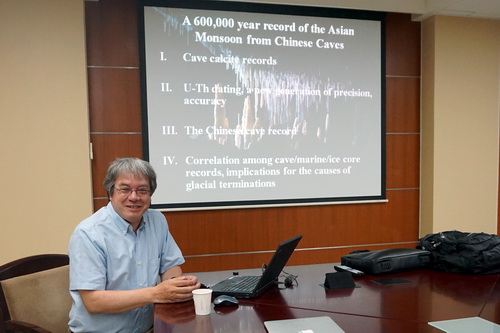 艾思本教授来我所访问期间作了题为A 600000 year record of the Asian Monsoon from Chinese caves的学术报告。他介绍了石笋记录古气候信号的机理,铀系定年方法的发展历程和我国石笋(葫芦洞,三宝洞和董哥洞)64万年以来氧同位素序列与两极冰芯以及海洋记录的对比关系。根据以上内容,他提出了如下结论:1、利用石笋重建古气候首先要挑选能够利用230Th方法精确定年的石笋样品(高铀含量,低杂质含量);2、虽然太阳辐射控制了亚洲季风在轨道尺度和千年尺度上的变化,但它们的机理却大相径庭;3、在倒二冰消期时段,南极冰芯记录的大气CO2浓度的升高与海洋沉积物记录以及北半球夏季太阳辐射的升高一致;4、冰期结束的过程:1)大气甲烷含量升高,冰盖易于崩塌;2)太阳辐射轻微的升高导致冰盖开始融化,冰筏和淡水注入北大西洋;3)抑制北大西洋深水的形成和相关的热量传输,使北大西洋变冷,进而引起北大西洋海冰扩张,季风减弱,热带辐合带(ITCZ)南移;4)两极间的跷跷板效应使南大洋升温,引起大气CO2浓度升高,进而使冰盖持续融化,同时北半球太阳辐射也在升高。