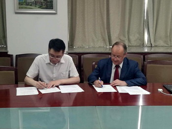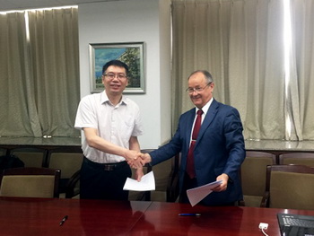 签约现场(杨进辉研究员<左>与Sergey Kabanikhin院士<右>)