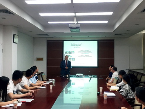 签约仪式后,Sergey Kabanikhin院士和Maxim Shishlenin教授分别作了题为“Multidimensional inverse acoustic problems”和“Continuation of the solutions of PDE with the data given on the part of the boundary”的学术报告。报告约2个小时,分别从地震波动方程的密度反演问题、海啸预警、地质雷达中反演问题的求解方法以及已知部分观测数据情况下偏微分方程数值解的解析延拓方法进行深入浅出的介绍。油气资源重点实验室的科研人员和研究生20余人参加了报告会,并与两位老师进行了深入的讨论与交流。此次报告会,既为研究生普及了求解反演问题的快速Toeplitz求解方法、Monte Carlo、梯度下降优化算法等方法,也为科研人员解决地球科学中的反演问题提供了研究思路。