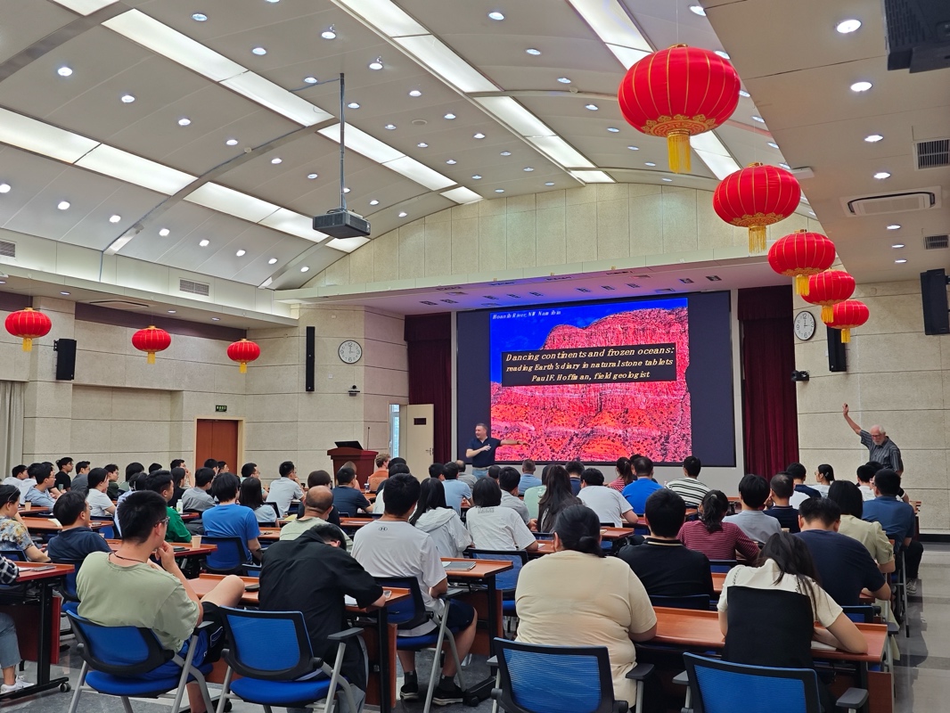 Hoffman教授的两场报告题目分别为“Dancing continents and frozen oceans: the Earth in adolescence(跳舞的大陆与冰冻的海洋:地球的青春期)”和“Constriction of subduction plates at cusps: Ocean and continental examples of Cenozoic and Ediacaran age(凹陷处俯冲板块的收缩:新生代与埃迪卡拉纪的海陆例证)”,他以宏大的地球视野、开创性的学术思想和生动深入的讲解,充分展现了其作为世界级地质学家的学术魅力,报告吸引了众多科研人员、研究生的热情参与,引发了与会者的热烈讨论与交流。