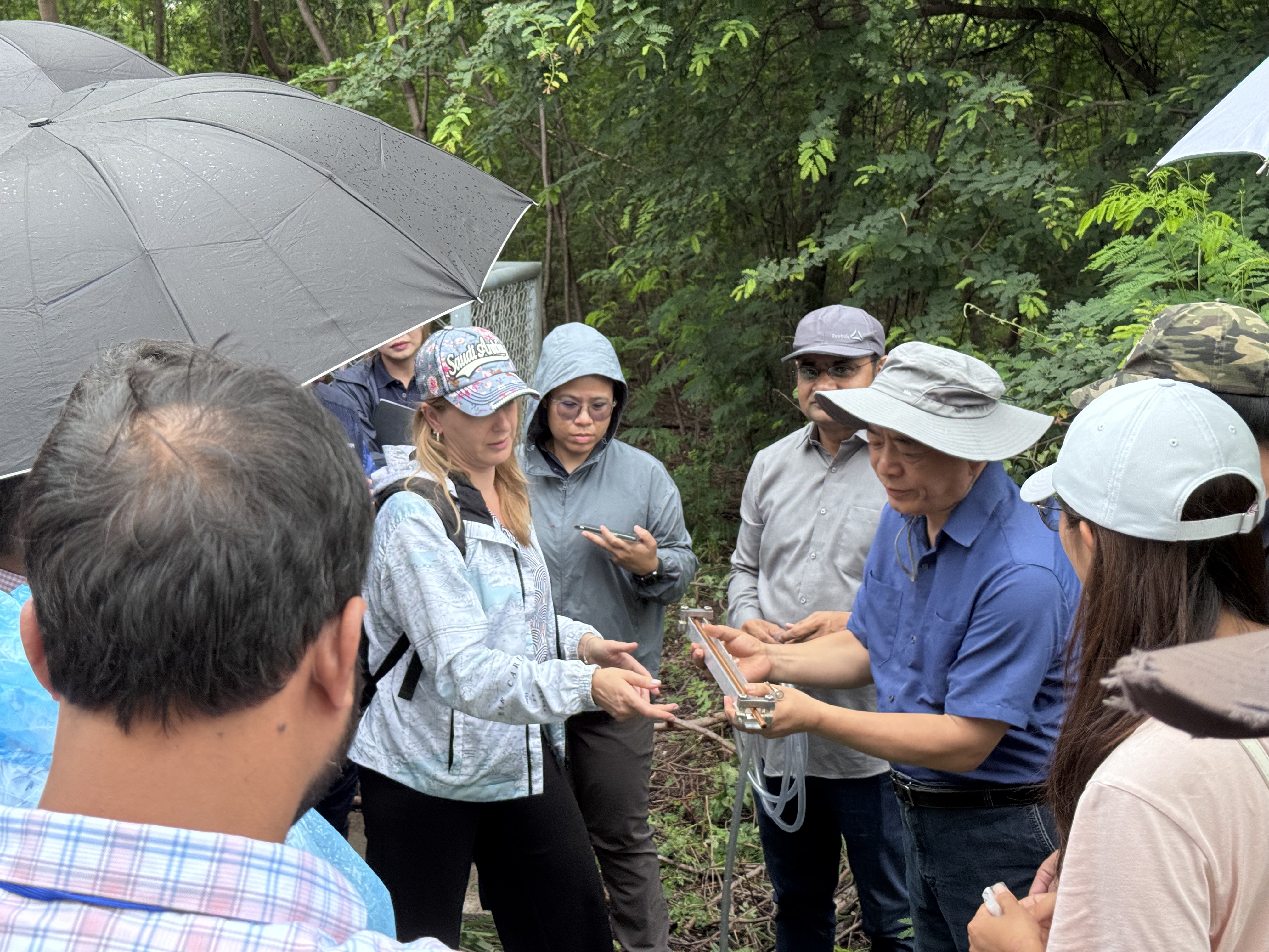 庞忠和研究员在野外演示地下水气体铜管采样方法