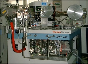 MAT253同位素比值质谱仪是目前国际上最先进的气体稳定同位素分析仪器,由美国Thermo Scientific公司制造,于2003年引进。它具有较宽的质量数范围(1-150道尔顿),较高的灵敏度(离子/800分子),质量分辨率可达200。MAT253稳定同位素比值质谱仪提供 D/H、 13C/ 12C、15N/ 14N、18O/16O和29Si/ 28Si同位素比值的高精度测定。