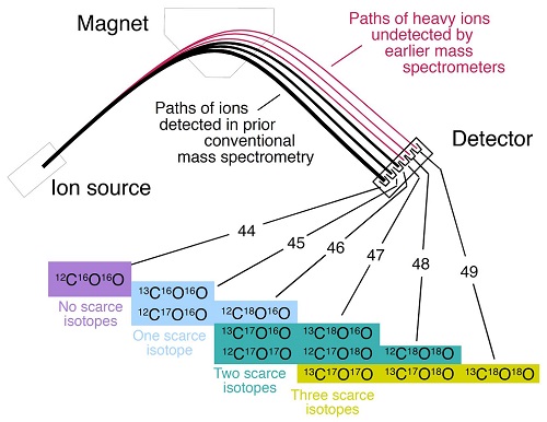 首先将样品转化为纯的气体,待测气体通过扩散或He载气携带进入离子源,在电子轰击作用下变为带电荷的离子,然后经过电场加速后进入磁场,根据质荷比(m/z)的大小以不同半径发生偏转,从而实现对不同质量数的同种分子的分离,最后不同质荷比的带电离子分别被不同位置上的接收杯所接收、计数,通过计算给出同位素组成。下图为CO2气体各同位素的分离、检测示意图。