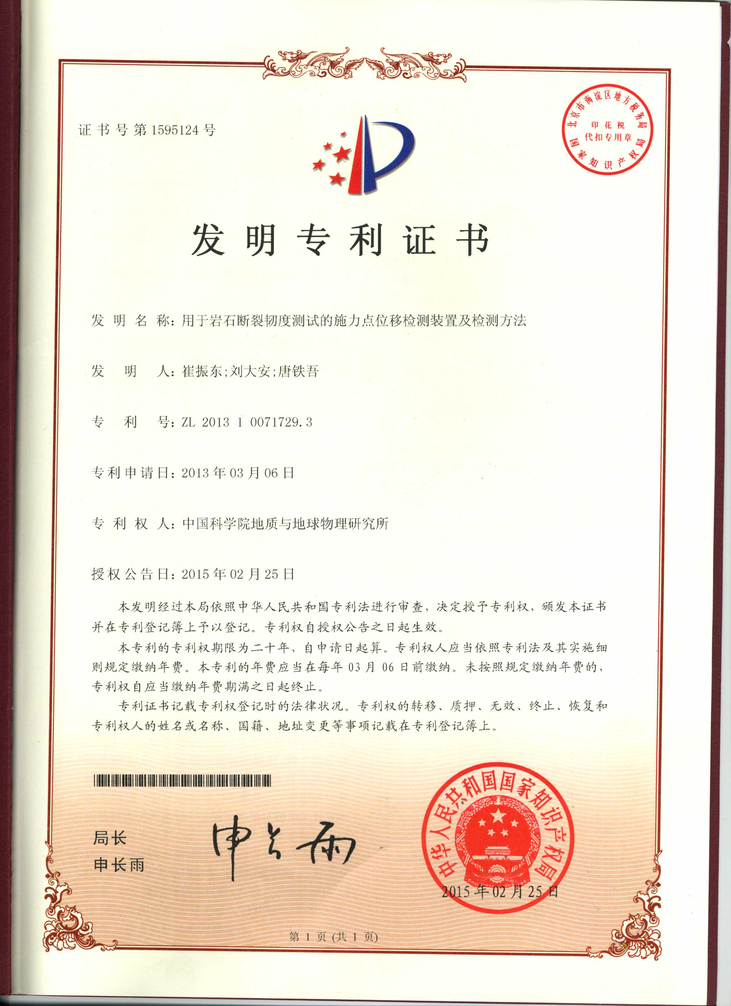 近日,中科院800彩票地质工程与地质灾害学科组崔振东副研究员等发明人完成的“用于岩石断裂韧度测试的施力点位移检测装置及检测方法”获得国家发明专利授权,其专利号为:ZL201310071729.3。