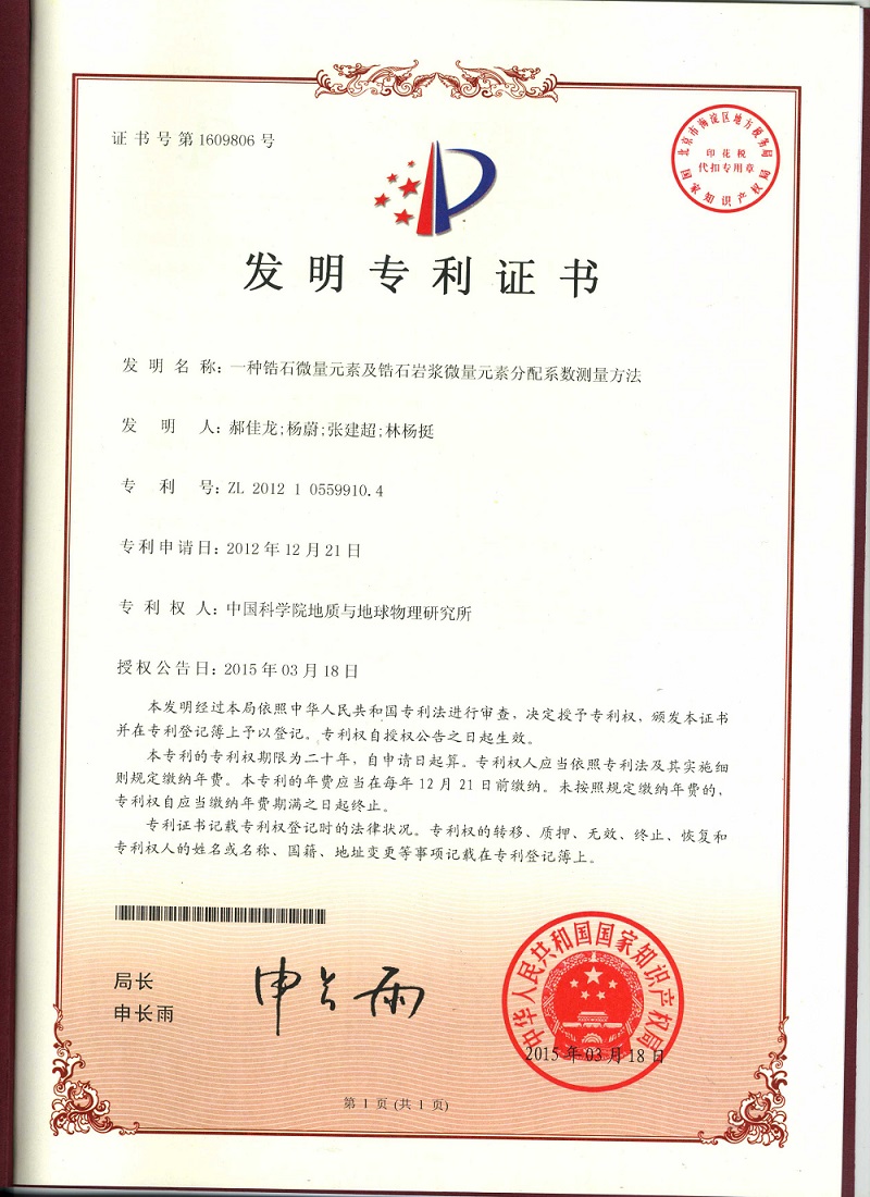近日,中科院800彩票纳米离子探针实验室郝佳龙工程师等人完成的“一种锆石微量元素及锆石/岩浆微量元素分配系数测量方法”获得国家发明专利授权,其专利号为:ZL201210559910.4。
