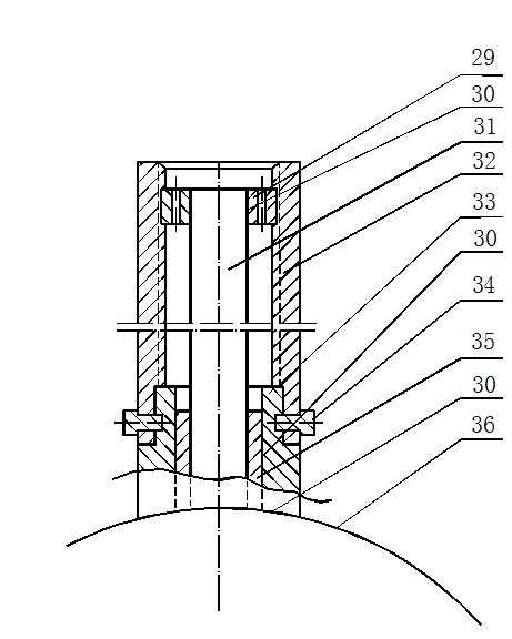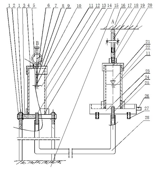 附图标记说明:1.螺帽;2.测量筒立脚; 3.测量筒底盘;4.注水口;5.百分表;6.顶盖测量孔;7.横测板;8.多节测量杆;9.测量筒顶盖;10.针尖式测头;11.水面;12.测量筒透明筒体;13.测量筒空心插管;14.测量筒O形环;15.测量筒固定点;16.顶板待测点;17.珠形测头;18.立杆;19.长度调节杆;20.溢流筒上盖;21.溢流倒三角口;22.溢流筒透明筒体;23.溢流筒接水盘;24.溢流筒空心插管;25.溢流筒的O形环;26.圆形水泡;27.临时支杆接头;28.连通管; 29.提压件;30.胶;31.传递杆;32.外连接件;33.内连接件;34.小圆杆件;35.保护套;36.百分表圆外壳