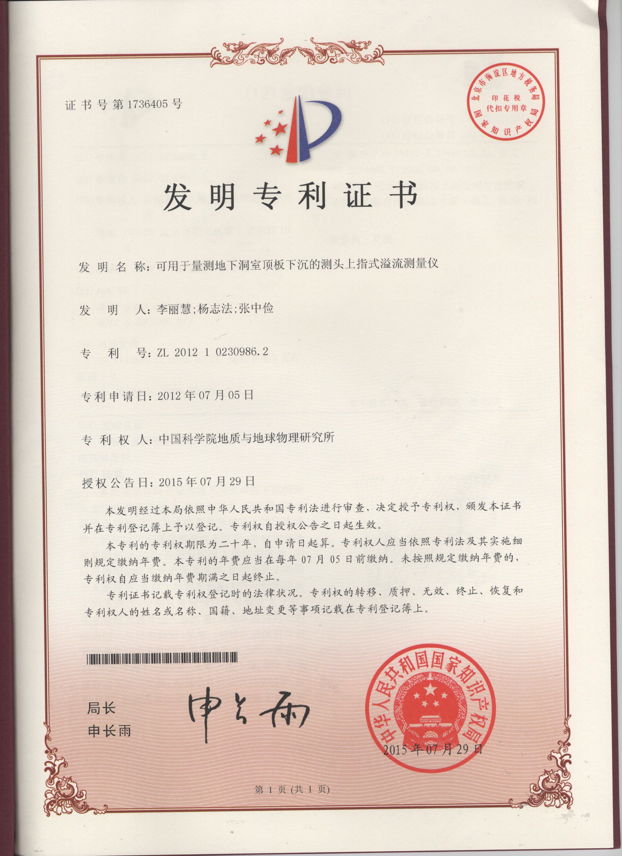 中科院800彩票工程地质与水资源研究室李丽慧副研究员等人完成的“可用于量测地下洞室顶板下沉的测头上指式溢流测量仪”发明专利近日获得国家专利授权,其专利号为:ZL201210230986.2。