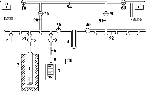 图1:制备系统图 1.样品管;2.加热炉;3.活塞堵头;4.冷阱;5.阀门(9、10、20、30、40、50、60);6.收集管;7.冷液;8.石英细管;80.封装好的水样管;I.低真空计;II.高真空计