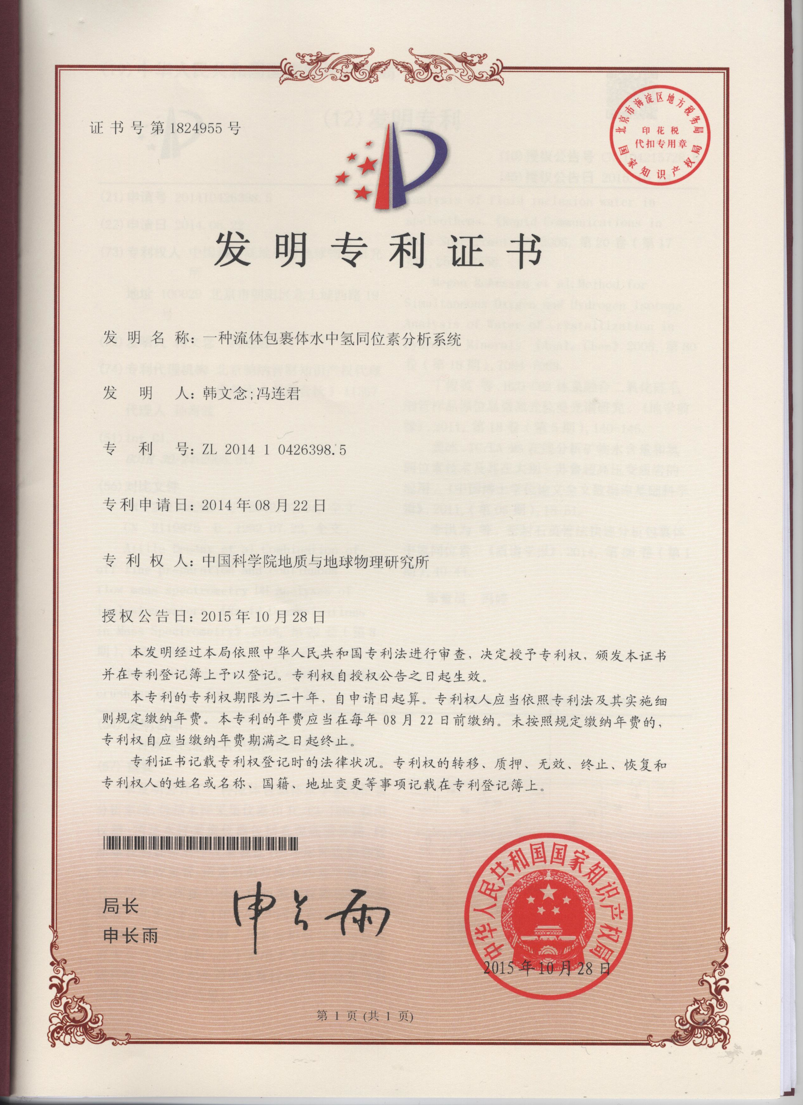 800彩票稳定同位素分析实验室韩文念工程师等人提出一种流体包裹体水中氢同位素分析系统,并于近日获得国家发明专利授权(专利名称:一种流体包裹体水中氢同位素分析系统;发明人:韩文念,冯连君;专利号:ZL 2014 1 0426398.5)。该发明提供了一种流体包裹体水中氢同位素分析系统和方法,其特点是:将包裹体在离线真空系统中爆裂释放的水样收集密封于石英玻璃小管,通过高温裂解元素分析仪的固体进样器进入高温反应管释放并裂解,与TC/EA-IRMS在线测定法相结合,实现流体包裹体水中氢同位素的高通量分析。