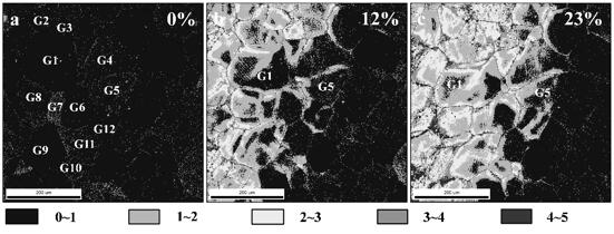 图b 原位EBSD技术获取的拉伸试样在宏观变形为0%、12%、23%时的晶粒KAM应变图