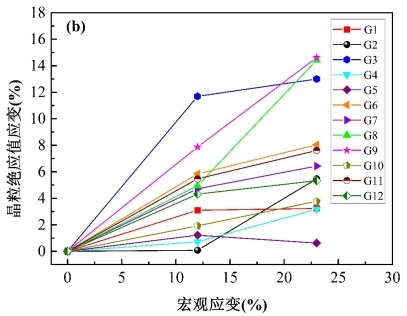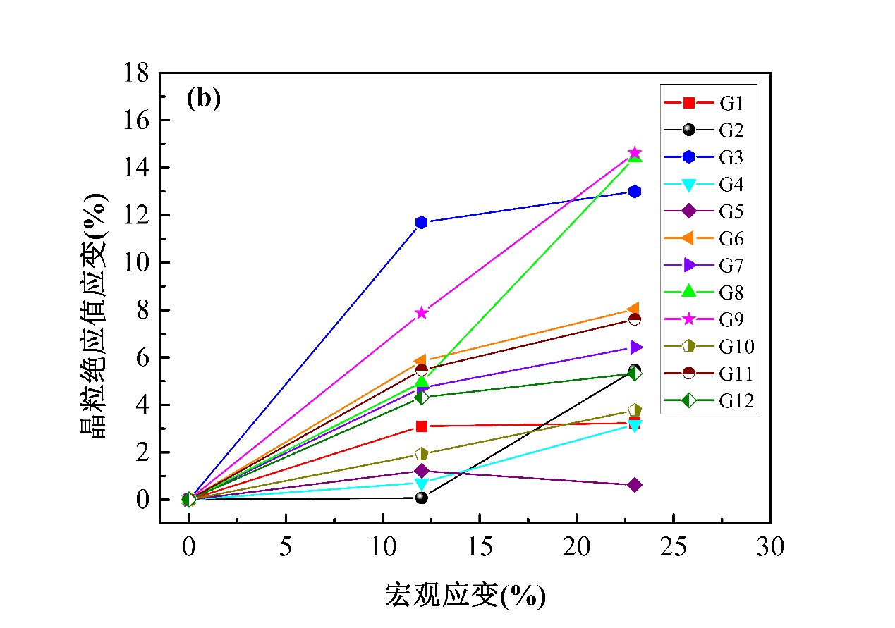 图3 拉伸试样的晶粒绝对值应变与宏观应变的比对图
