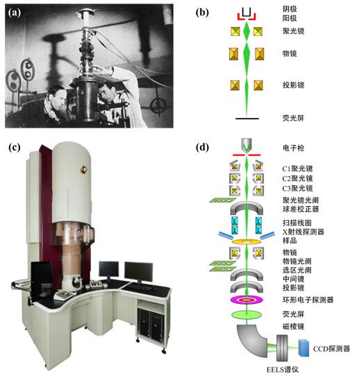 图1 (a)20 世纪30 年代初鲁斯卡(右)和克诺尔(左)研制的电子显微镜;(b)最初的电子显微镜光路图;(c)现代球差校正透射电镜;(d)聚光镜球差校正透射电镜结构示意图。