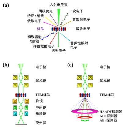 图2 (a)入射电子与样品相互作用后产生的各种信号;(b)常规透射电子显微镜工作原理示意图;(c)扫描透射电子显微镜工作原理示意图