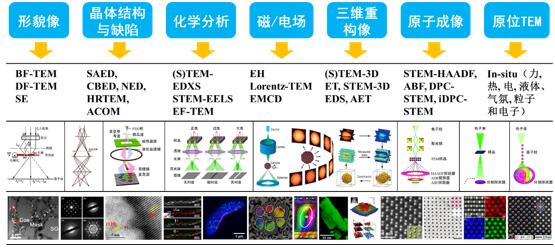 备注:BF-TEM:明场像;DF-TEM:暗场像;SE:二次电子像;SAED:选区电子衍射;CBED:会聚束电子衍射;NED:纳米电子衍射;HRTEM:高分辨透射电子显微像;TEM:透射电子显微术(镜);ACOM:自动晶体取向成像术;STEM:扫描透射电子显微术(镜);STEM-HAADF:高角环形暗场像;ABF:环形明场像;DPC-STEM:差分相位衬度成像;iDPC-STEM:积分微分相位衬度成像;EDXS:X射线能量色散谱;EELS:电子能量损失谱;EF-TEM:能量过滤透射电子显微术;EH:电子全息术;Lorentz TEM:洛伦兹电子显微术;EMCD:电子磁手性二向色性技术;3D ET:电子三维重构技术;STEM-3D EDXS:X射线能量色散谱三维重构技术;AET:原子电子三维重构技术;In-situ TEM:原位透射电镜显微术;cryo-TEM:冷冻透射电镜显微术。