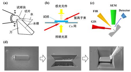 透射电镜实验对观察的样品要求极高,要求测试的样品直径不大于3 mm,厚度≤~100 nm,如果要观察高分辨和STEM-HAADF 图像等,则要求样品更薄(如小于50 nm),且要求样品表面干净,无碳氢污染物和非晶层。常见的样品可分为纳米材料/矿物和块体试样,因而本文主要介绍这2类样品的制备方法。(1)将纳米尺度的矿物或材料在分散介质中分散成悬浮液,再用移液器吸取特定量的悬浮液滴至TEM金属载网碳膜上,经过干燥后直接进行透射电镜分析。表2列举了不同的TEM 铜载网碳膜类型参数及其适用的纳米材料。块体试样的制备方法主要是借助超薄切片仪,离子减薄仪和聚焦离子束显微镜,其工作原理见图4。