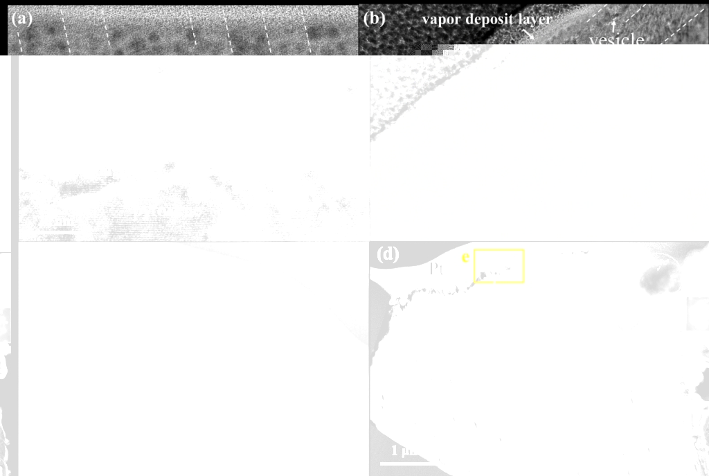 分析结果表明,暴露在玄武岩碎屑表面的所有矿物相都存在富Si/O元素的再沉积层,往下是太阳风辐照损伤层,但太阳风损伤层的结构和化学成分变化与基体矿物的种类有关(图2)。纳米铁(npFe0)、非晶化和囊泡结构是最常见的太空风化特征。我们发现辉石受太阳风辐照后损伤层的片层结构与辉石基体的出熔片层结构一致,提供了太阳风还原纳米铁的确凿证据。表面损伤层发生了非晶化,非晶层内的纳米铁颗粒呈球形,但晶粒尺寸(~3-5 nm)与基体片层的铁含量相关。钛铁矿受太阳风辐照保持了晶体结构,但发生了Fe-Ti元素迁移,还原的纳米铁颗粒呈拉长形(~20 nm)。硫化物表面呈锯齿状结构,没有明显的太阳风作用区域,主要是硫化物受太阳风离子剥蚀造成脱硫而形成铁晶须(几十nm~300 nm)。贫铁的白磷钙矿表面没有发现纳米铁颗粒。另外,钛铁矿和白磷钙矿的损伤层都出现了囊泡结构,但其形态不同,可能与各自的晶体结构及受到的表面张力有关。