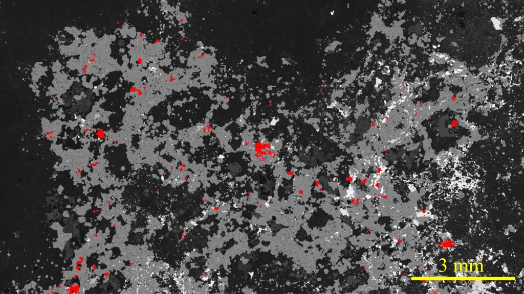 图2 铌矿物快速识别和精准定位(红色自动标记区域为铌矿物)