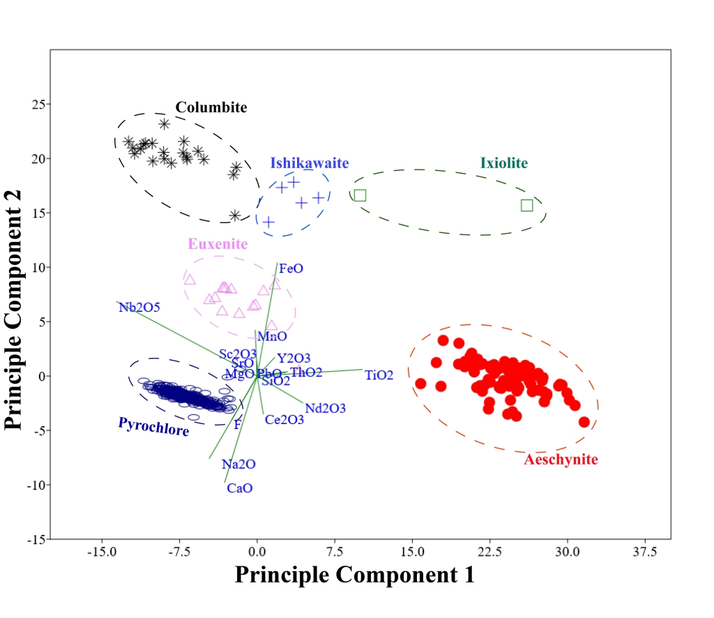 铌(Nb)是医疗、航空航天、冶金能源和国防军工等行业不可缺少的重要战略性金属资源。我国白云鄂博是超大型稀土-铌-铁矿床,氧化铌的远景储量达660万吨,占全国储量的95%。对富铌矿物的赋存状态开展研究,有助于查明铌的分布规律,提高铌矿床选冶效率。然而,白云鄂博矿床的铌矿物种类繁多,且具分布分散、粒度小、成分和共伴生关系复杂等特点,如何精准识别和定位这些矿物并进行分类,往往给科研人员带来困扰。该团队针对这一问题,在白云鄂博碳酸盐样品的基础上,建立了铌矿物快速识别、精准定位和定量分析方法。通过电子背散射图像灰度阈值校正、两次图像采集和两次能谱采集,极大地缩短了对铌矿物识别和定量分析的时间,15分钟即可实现118平方毫米区域内微米级铌矿物的快速识别和精准定位(图2),整个薄片尺度可在3小时内完成。基于自动标记区域的能谱定量分析数据,结合主成分分析(PCA)统计学方法,即可实现不同铌矿物的准确分类(图3)。该方法也可用于稀土矿床中稀土矿物、天体样品中微细定年矿物等在大尺寸范围内的快速识别、精准定位和分类。