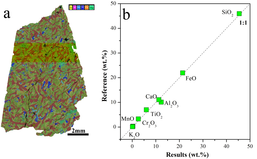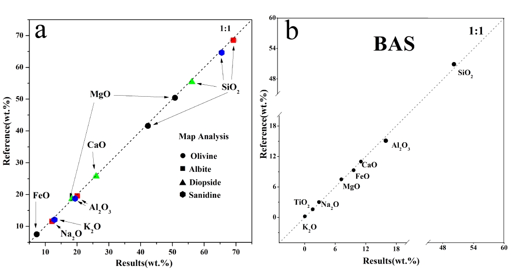 嫦娥五号月壤具有细小、珍贵、颗粒多、成分复杂等特点,平均粒径不足50微米。获取如此细小颗粒的全岩成分,是对微束分析技术的一次挑战。传统方法通常运用电子探针分析获取矿物平均成分,用面积法统计矿物含量,再结合矿物密度,计算出月壤的全岩成分。然而,月壤矿物(如橄榄石和辉石)普遍发育显著的成分环带,为矿物平均成分统计带来很大的不确定性。因此,传统方法不仅效率低,误差也大。针对这一问题,该团队建立了单颗粒月球样品全岩主量元素无损分析方法。他们首先使用 MAC国际标准矿物为能谱定标(图4),检测限为0.1 wt%,对于含量>1 wt%的元素, 分析精度优于2-5%。在此基础上,通过能谱定量mapping技术,直接准确获得矿物的平均成分,再结合矿物含量与密度,最终可确定单颗粒月壤的全岩成分。将新方法运用于月球陨石NWA4734号样品,在误差范围内与其他化学分析方法的推荐值一致(图5)。该新方法已成功应用于嫦娥五号月壤样品研究。由于该方法不受样品形状的限制,不仅可用于月球、小行星、火星等珍贵样品的全岩成分分析,还可以针对薄片尺度内任意形态微区开展局部全岩成分分析。