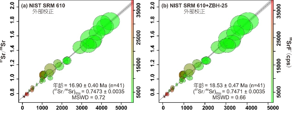 随后对产自西藏吉隆地区的钠长花岗岩样品21JL18-2进行了激光原位微区Rb-Sr等时线年龄分析。结果显示仅依赖NIST SRM 610玻璃的一步校正法的结果明显偏离了该样品的Th-Pb年龄值(图3a),而经过两步校正法的结果与Th-Pb年龄值(18.3 ± 0.2 Ma)在误差范围内一致(图3b)。