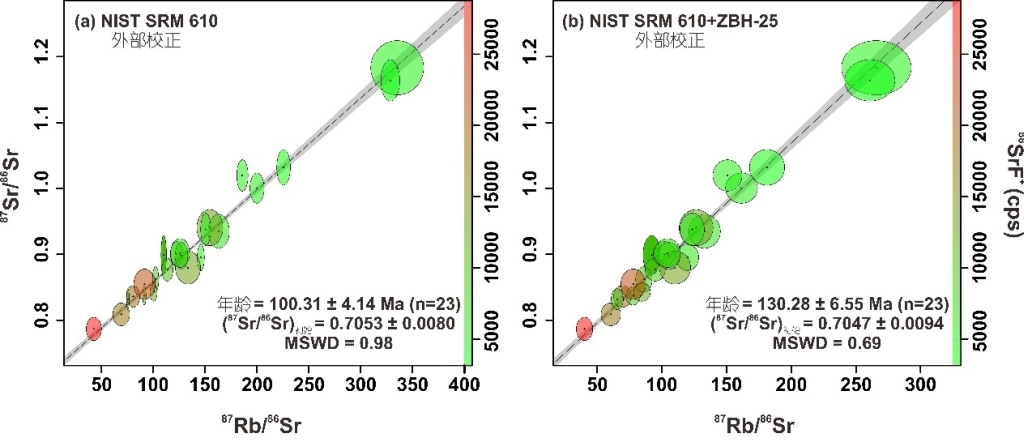 图3 21JL18-2天然样品的激光原位微区Rb-Sr同位素等时线年龄。(a)一步校正法结果(NIST SRM 610标准玻璃);(b)两步校正法结果(NIST SRM 610标准玻璃+ZBH-25黑云母)