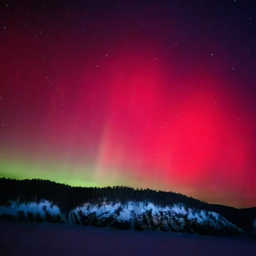 此次极光自然奇观是由两个太阳活动区(AR3936和AR2932)爆发共同作用引起的。地球磁场因此产生了剧烈扰动,地磁Kp指数达到了约8,属于特大地磁暴水平。太阳高能粒子激发了地球大气层中的原子和分子,不同的原子分子谱线产生了不同颜色的极光。