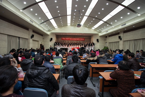 中国科学院大学(简称“国科大”)博士合唱团,应邀于12月19日晚在我所新楼报告厅举办了“科研之韵、青春之声”专场音乐会,国科大副校长马石庄教授亲自率团演出并担任主持人。合唱团美妙的和声、青春的活力、奔放的激情、专业的素养,以及马石庄教授诙谐幽默的客串主持,深深吸引、打动了观众,不仅让观众充分感受了合唱艺术的魅力,而且在轻松愉悦的氛围中丰富了音乐知识。演出活动自始至终洋溢着热烈、亲切、欢乐、享受的气氛,期间观众潮水般的掌声、喝彩声此起彼伏。
