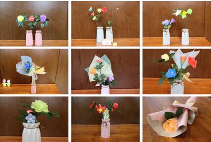 康乃馨象征着爱与温暖,是美好的典范,此次活动以制作“手工康乃馨”为主题花展开。活动开始,在志愿者讲师杨梓涓同学的教学指导下,同学们了解了制作粘土花所需材料和基本步骤,并纷纷开始体验创作。他们首先选择自己喜欢的花朵颜色,再利用粘土材料分别制作花蕊、花瓣、花萼,并将其组合拼贴,再用彩色的包装纸和彩带将其包装成漂亮的花束,最后插入研会为大家准备的精美花瓶中。同学们积极尝试,现场氛围十分活跃,最后将包装好的花束放入花瓶中进行插花设计。